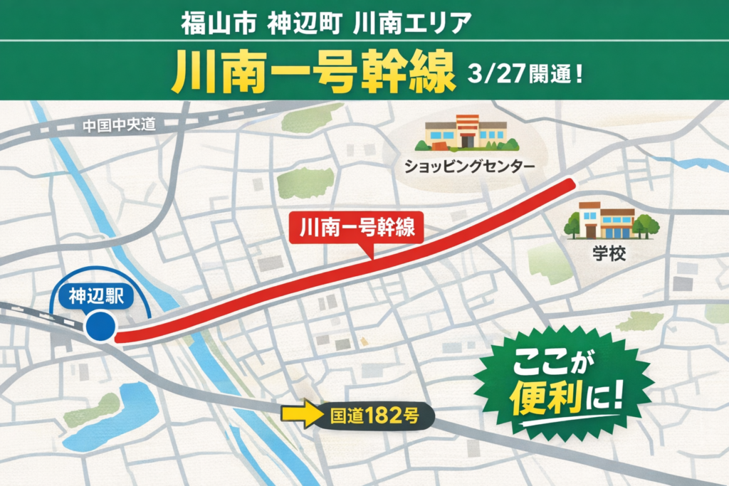 本日も「福山市中古住宅.com」をご覧いただき、 誠にありがとうございます😊 2026年3月27日、 神辺町川南エリアにて進められている土地区画整理事業の中で、 👉 「川南一号幹線」が開通…